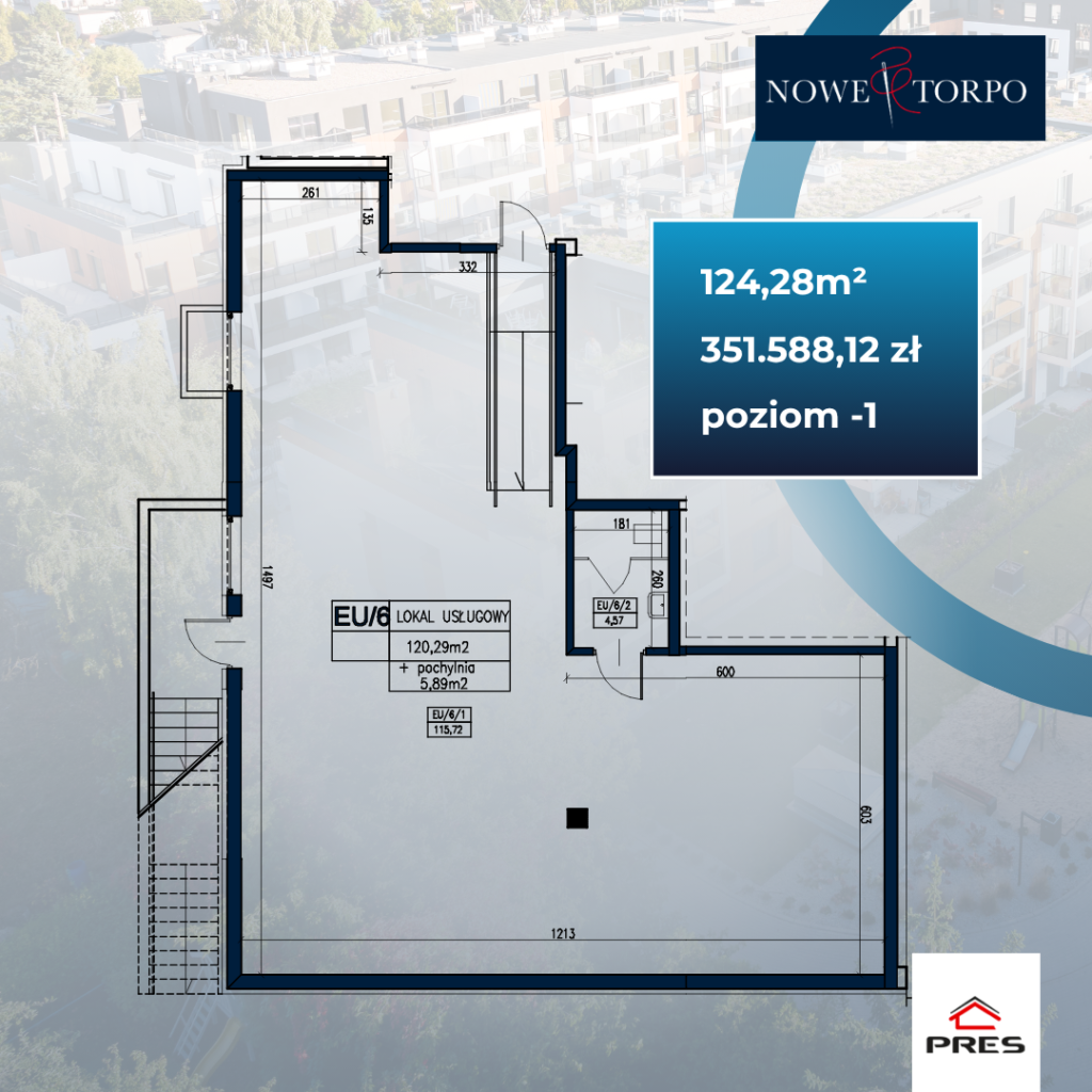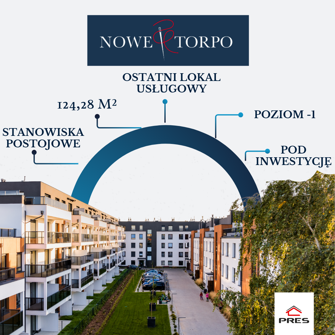 22 kwietnia 2026W inwestycji TORPO dostępny jest ostatni lokal usługowy o powierzchni 124,28 m², zlokalizowany na poziomie -1. Nieruchomość jest dostępna od zaraz, a jej cena wynosi 2 829 zł/m² brutto, co czyni ją jedną z bardziej atrakcyjnych ofert na rynku nieruchomości komercyjnych w Toruniu.